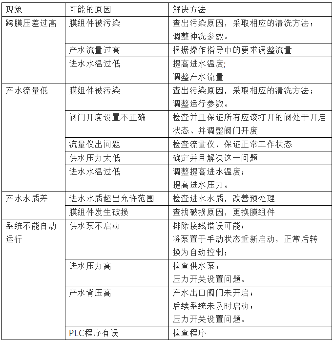 導(dǎo)致超濾系統(tǒng)故障的原因,可能來自于超濾系統(tǒng)本身,也可能來自于預(yù)處理系統(tǒng)、加藥系統(tǒng)、電儀系統(tǒng)和或者控制系統(tǒng)等,根據(jù)超濾系統(tǒng)出現(xiàn)故障類型和位置,通常可以確定故障的起因,針對(duì)不同的原因可以采取對(duì)應(yīng)的糾正措施進(jìn)行排除。